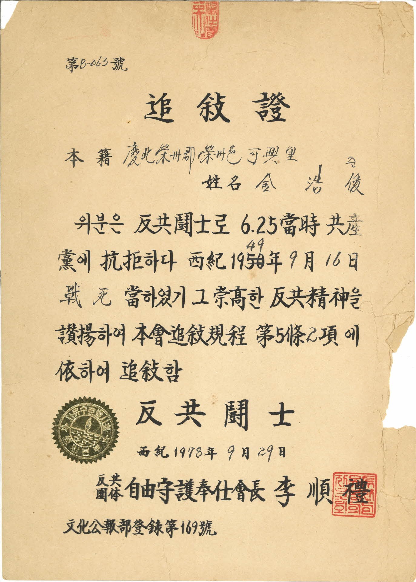 이 추서증(追敍證)은 1978년 9월 29일 반공단체 자유수호봉사회장 이순례(李順禮)가 김호준(金浩俊)에게 발급한 것이다. 내용은 반공투사 김호준이 한국전쟁 당시 공산당에 항거하다 전사하여 그 숭고한 반공정신을 기려 추서한다는 내용이다.