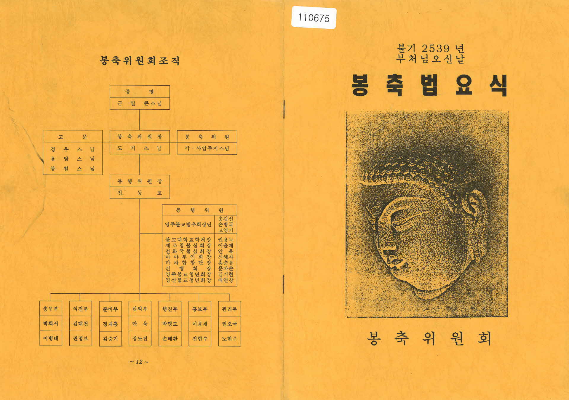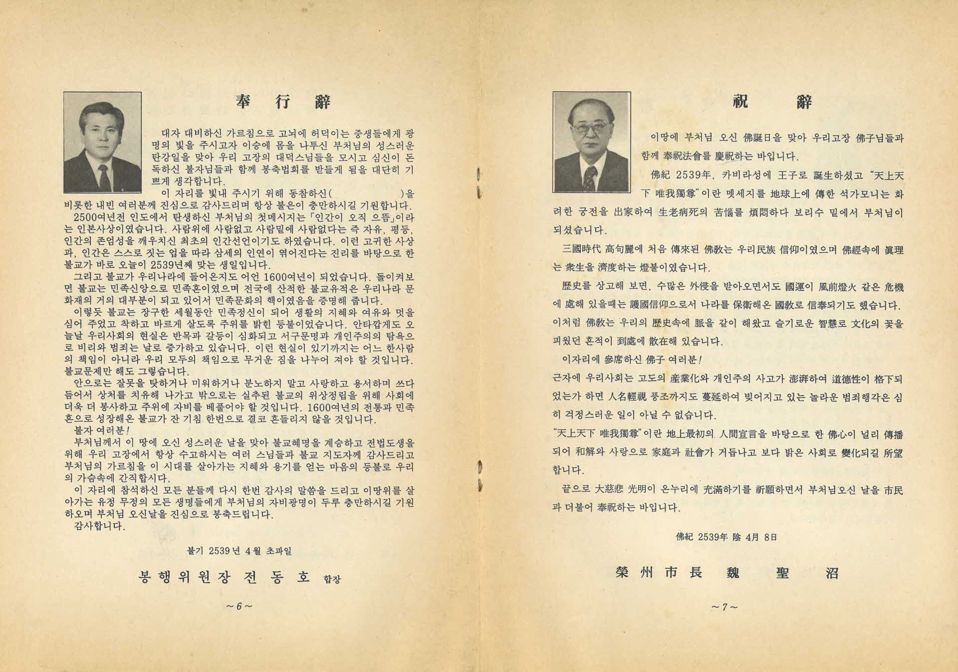이 자료집은 1995년 4월 8일(음력) 봉축위원회가 발간한 부처님 오신날 봉축행사 자료집이다. 이 자료집에는 봉축법회 식순, 집회가, 삼귀의, 찬불가, 마하반야바라밀다심경, 봉행사, 축사, 청법가, 봉축법어, 발원문, 사홍서원, 산회가, 봉축위원회 조직도 등이 수록되어 있다. 봉축위원장은 김도기, 봉행위원장은 전동호이다.