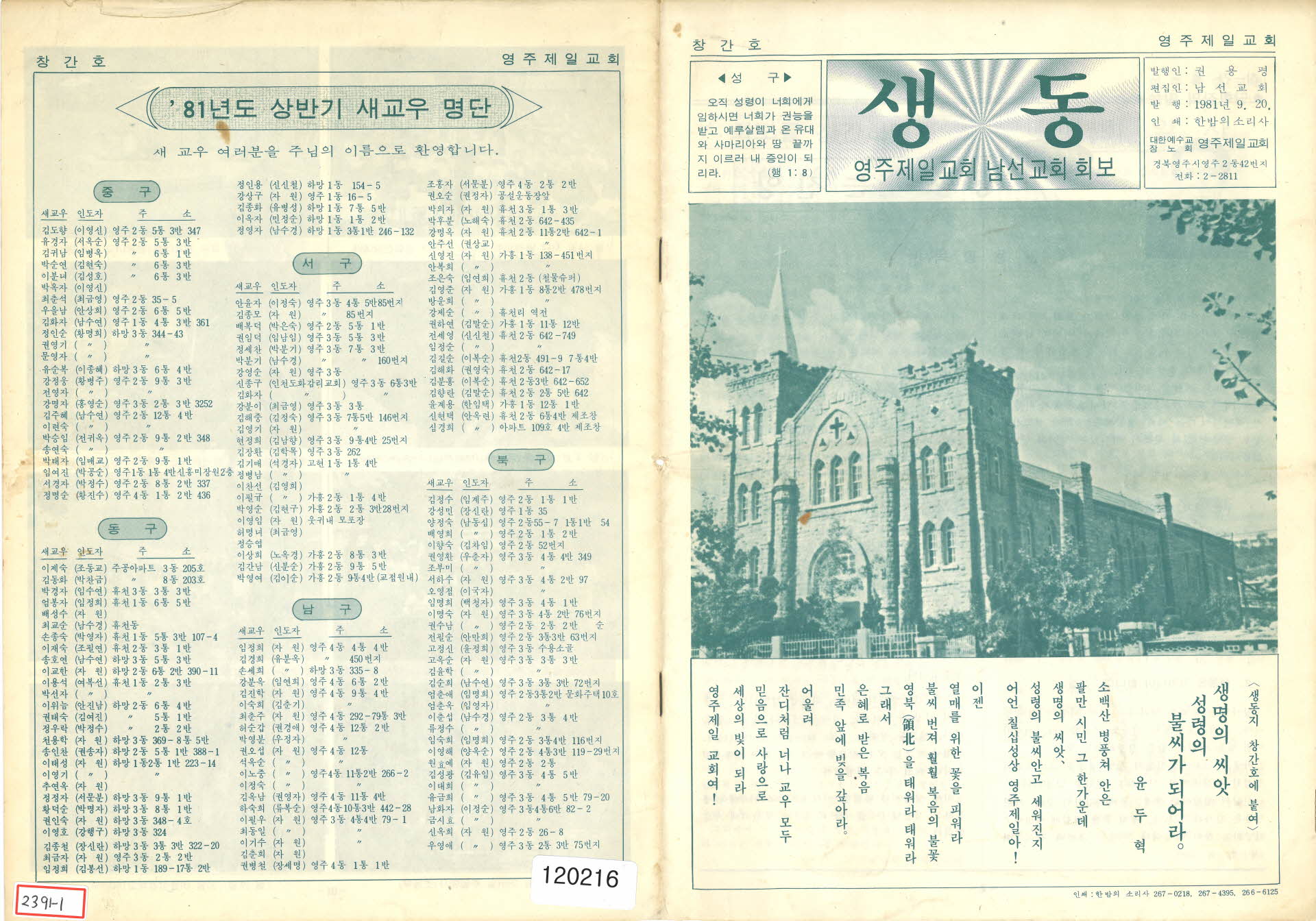 『생동』은 영주제일교회 남선교회의 회보이다.