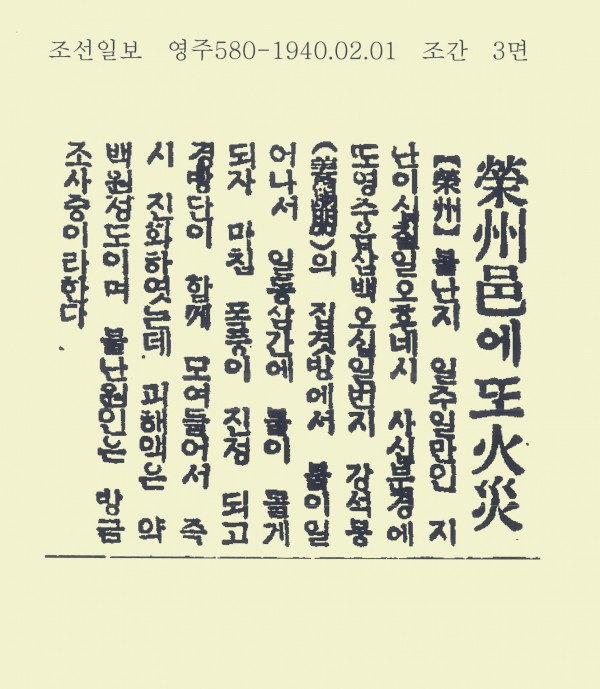 불난지 일주일 만인 지난 27일 오후 4시 40분경에 또 영주읍 351번지 강석붕(강석붕)의 집 겻방에서 불이 일어니 일동 삼간에 불이 붙게 되자 마침 폭풍이 진정되고 경망단이 함께 모여들어서 즉시 진화하였는데 피해액은 약 100원정도 이며 불난 원인은 방금 조사중이라 한다.