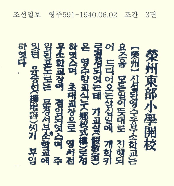 영주동부소학개교(榮州東部小學開校) 페이지 정보 본문 신설된 영주동부소학교는 요즈음 모든일이 뜻대로 진행되어 드디어 오는 30일에 개학키로 결정되었는데 가교실(假敎室)은 영주향교 식루(食樓)로 정하였으며 초대교장으로 영서전무 소학교장이 겸임되었으며 주임된 훈도로는 문경서부소학교에 있던 유증선(柳增善)씨가 부임했다. 오류신고 목록 이전글 영주중등교(榮州中等校) 기성회정총(期成會定總) 다음글 영주물가좌담회(榮州物價座談會)