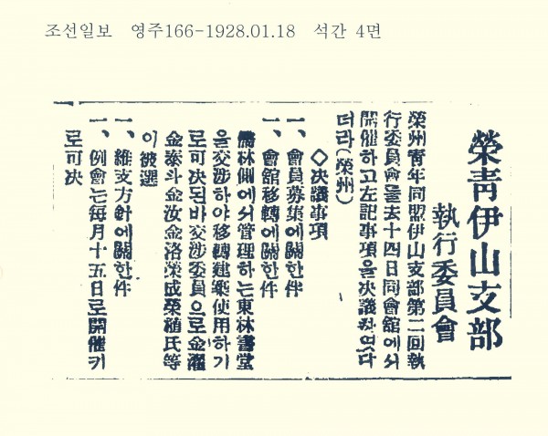 영주청년동맹 이산지부 제2회 집행위원회를 14일 동회관(同會舘)에서 개최하고 아래 사항을 결의하였다.
