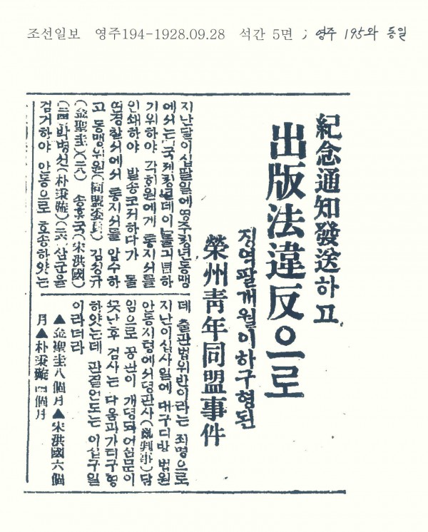 기념통지발송(紀念通知發送)하고 출판법위반(出版法違反)으로 징역 8개월 이하 구형된 영주청년동맹사건(榮州青年同盟事件)