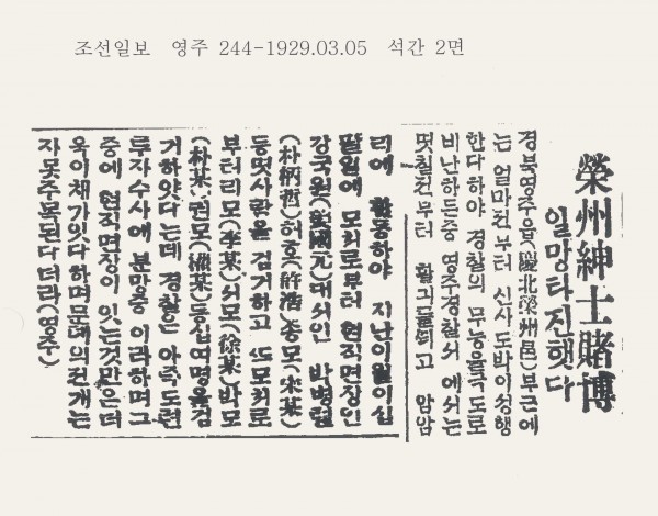 경북 영주 부근에는 얼마전부터 신사도박이 성행한다하야 경찰의 무능을 극도로 비난하든중 영주경찰서에서는 몇일전부터 활기를 띠고 암암리에 활동하여 지난 2월 28일에 도처로부터 현직 면장인 강국원 대서인, 박병렬, 허 호 등 몇사람을 검거하고 또 모처로부터 이모(李某), 서모(徐某), 박모(朴某), 권모(權某) 등 10여명을 검거하다는데 경찰은 아직도 연루자 수사에 분망중 이라하며 그중에 현직 면장이 있는것만은 더욱 이채가 있다하며 문제의 전개는 자뭇 주목된다더라.