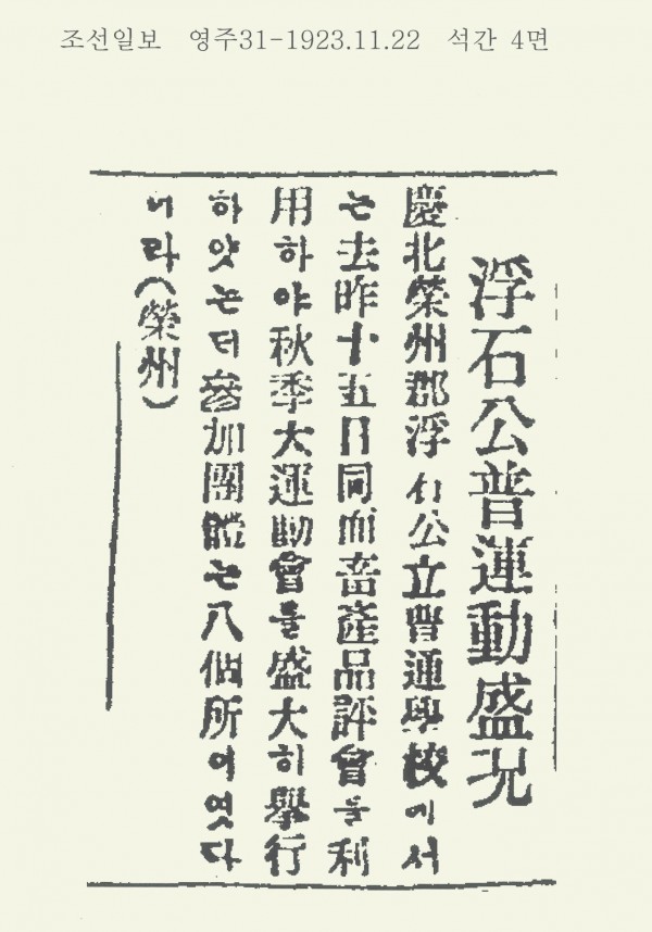부석공보운동 성황(浮石公普運動 盛況) 페이지 정보 본문 경북 영주군 부석공립 보통학교에서는 어제 15일 동면 축산품평회를 이용하여 추계대운동회를 성대히 거행하였는데 참가단체는 8개소였다. 오류신고 목록 이전글 영풍간 자동차 개통(榮豊間 自動車 開通)