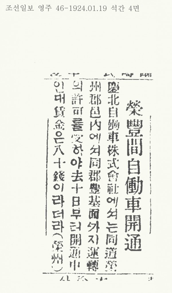 영풍간 자동차 개통(榮豊間 自動車 開通) 페이지 정보 본문 경북자동차 주식회사에서는 경북 영주군 읍내에서 동군(洞郡) 풍기면까지 운전의 허가를 취하여 10일부터 개통중인데 대금은 80전(錢)이라한다. 오류신고 목록 이전글 영주 이산면에 소비조합발기(消費組合發起) 다음글 부석공보운동 성황(浮石公普運動 盛況)