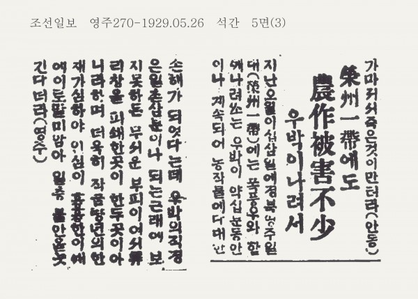 영주 일대에도 농작피해불소(農作被害不少) 우박이 내려서 페이지 정보 본문 지난 5월 23일에 경북 영주일대에 폭풍우와 함께 우박이 약 10분동안 게속되어 농작물에 대단한 손해가 되었다는데 우박의 직경은 1촌(寸) 3분(分)이나 되는 근래에 보지못한 무서운 부피이어서 유리창을 파쇄한곳이 한두곳이 아니라하며 더욱이 지금 당년의 한해가 심하여 인심이 흉흉하니 이로 말미암아 일층 불안을 느낀다 한다. 오류신고 목록 이전글 영주청맹기념(榮州靑盟紀念) 경찰이 금지 다음글 영주청년동맹 간부 3인 공판(公判)