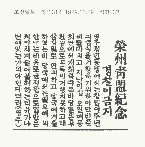 영주청맹기념(榮州靑盟紀念) 경찰이 금지 페이지 정보 본문 영주청년동맹에서는 창립2주년 기념식을 거행하기 위하여 만반의 준비를 마치고 지난 25일에 동회관에서 개최하려든바 당일은 우천으로 부득이 거행치 못하고 30일로 연기하고 당국에게 알렸는데 당국에서는 필요에 의한다는 이유로 금지함으로 일반은 불허하는 이유가 의아해 한다 더라. 오류신고 목록 이전글 영주청맹사건(榮州靑盟事件) 복심판결 언도(覆審判決言渡) 다음글 영주 일대에도 농작피해불소(農作被害不少) 우박이 내려서