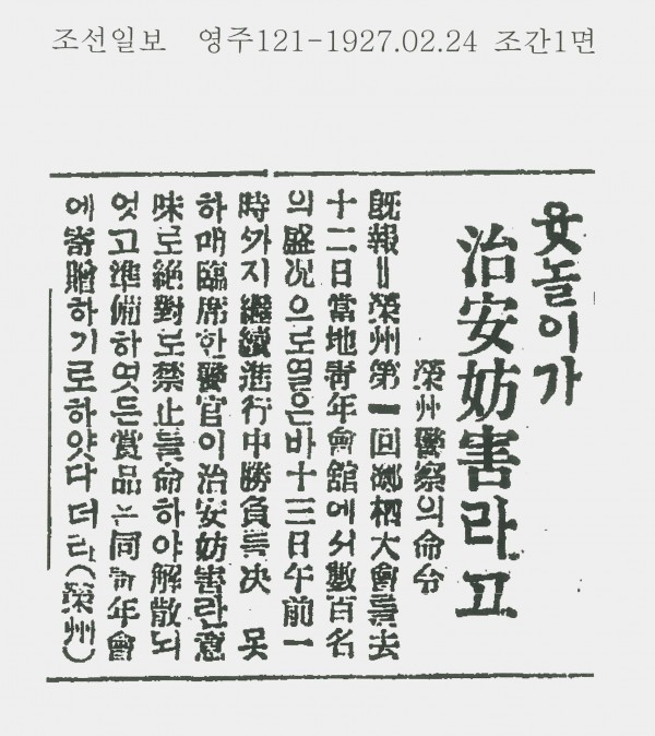 영주 제1회 척사대회를 12일 청년회관에서 수백명의 성황으로 개최했는데 13일 오전 1시까지 계속 진행중 승자를 결정하지 못하자 임석한 경관이 치안 방해란 의미로 절대 금지를 명하여 해산되었고 준비하였던 상품은 동청년회에 기증하기로 하였다.