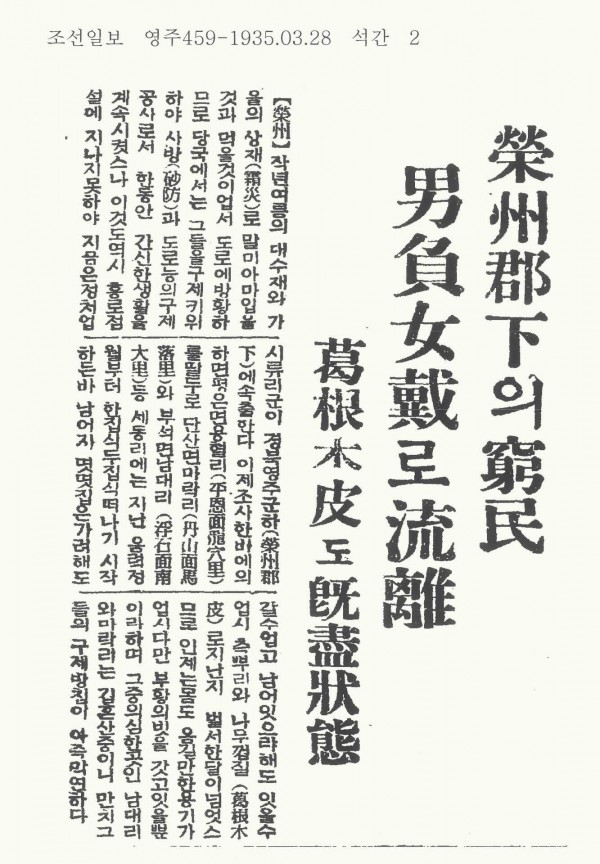 작년 여름의 대수재와 가을의 상재(霜災)로 말미암아 입을것과 먹을것이 없어 도로에 방황하므로 당국에서는 그들을 구제키 위하여 사방(砂防)과 도로 등의 구제공사로서 한동안 간신한 생활을 계속시켰으나 이것도 역시 홍로점설에 지나지 못하야 지금은 정처없이 유리군이 경북 영주 군하에 속출한다. 이제 조사한바에 의하면 평은면 용혈리를 필두로 단산면 마락리와 부석면 남대리 등 3동리에는 지난 음력 정월부터 한집씩 두집씩 떠나기 시작하는데 나머지 몇몇 집은 가려해도 갈 수 없고, 남아 있으려해도 있을 수 없어 칡뿌리와 나무껍질로 지낸지 벌써 한달이 넘었으므로 이제는 몸도 옮길 만한 용기가 없어 다만 부황의 빚을 갖고 있을뿐이라하며 그중의 심한곳인 남대리와 마락리는 깊은 산중이니 그들의 구제방침이 아직 막연하다.