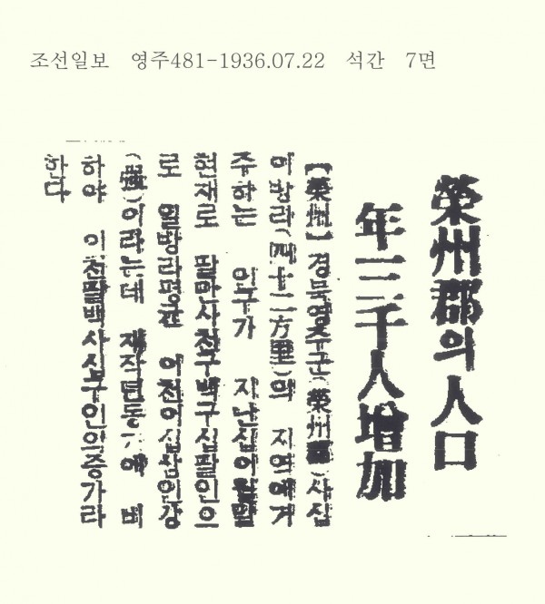영주군 인구(人口) 년 3천인 증가(增加) 페이지 정보 본문 경북 영주군 42방리(方里)의 지역에 거주하는 인구가 지난 12월말 현재로 84,998인으로 1방리 평균 2,023인이라는데 재작년 동기에 비하여 2,849의 증가라 한다. 오류신고 목록 이전글 동천제방(東川堤防)이 무너져 3천여 정보매몰(町步埋沒) 영주군 이산면 신암리에서 6백제민(六百災民), 산상피난(山上避難) 다음글 영주군미작통계(榮州郡米作統計)