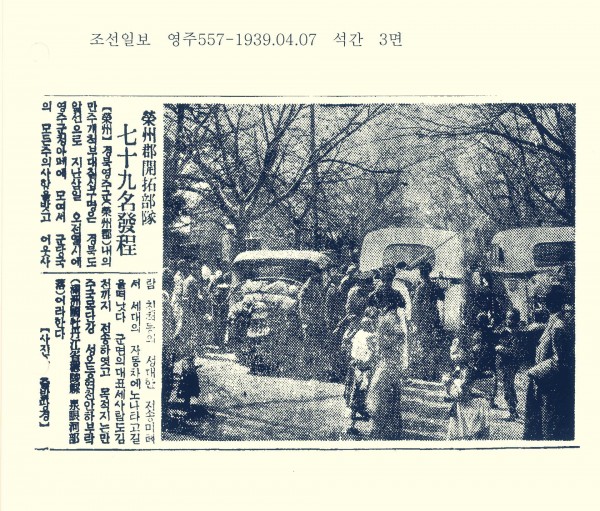 경북 영주군(榮州郡)내의 만주개척부대 79명은 경북도 알선으로 지난 3일 오전 10시에 영주군청 앞에 모여서 군당국의 모든 주의사항을 받고 이웃사람, 친척들의 성대한 전송후 3대의 자동차에 나누어 타고 길을 떠났다. 군면의 대표 세사람도 김천까지 전송하였고 목적지는 만주국 목단강 성은등현 천안하부락 이라한다.