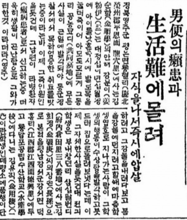 자식을 나서 즉시에 압살. 경북 영주군 평은면에 사는 김순학의 아내 강분이(22)는 대정 12년 10월 무렵 아이를 낳은 즉 발로 목을 눌러 죽이어 아무도 모르게 그 동리 공동 묘지에 묻은 사실이 근일에 발각되어 동군 경찰서에서 목하 엄중한 취조를 받는 중이라는 바 그 죽인 원인을 듣건데 그 남편이 나병 환자로서 신고하는 중 더욱이 생활이 곤란함으로 그와 같이 한 것이라더라.