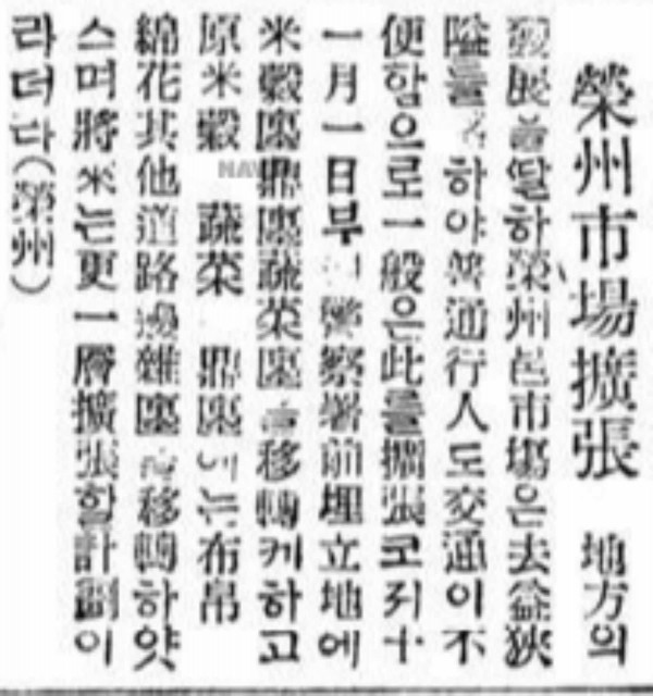 지방의 발전을 따라 영주읍시장은 거익 협애를 감하여 보통 행인도 교통이 불편함으로 일반은 차를 확장코저 11월 1일부터 경찰서 앞 매립지에 미곡전. 정진, 채소전을 이전케 하고 원 미곡, 소책, 정진(鼎塵)에는 포백면화 기타 도로변 잡전을 이전하였으며 장래는 다시 일층 확장할 계획이라더라.