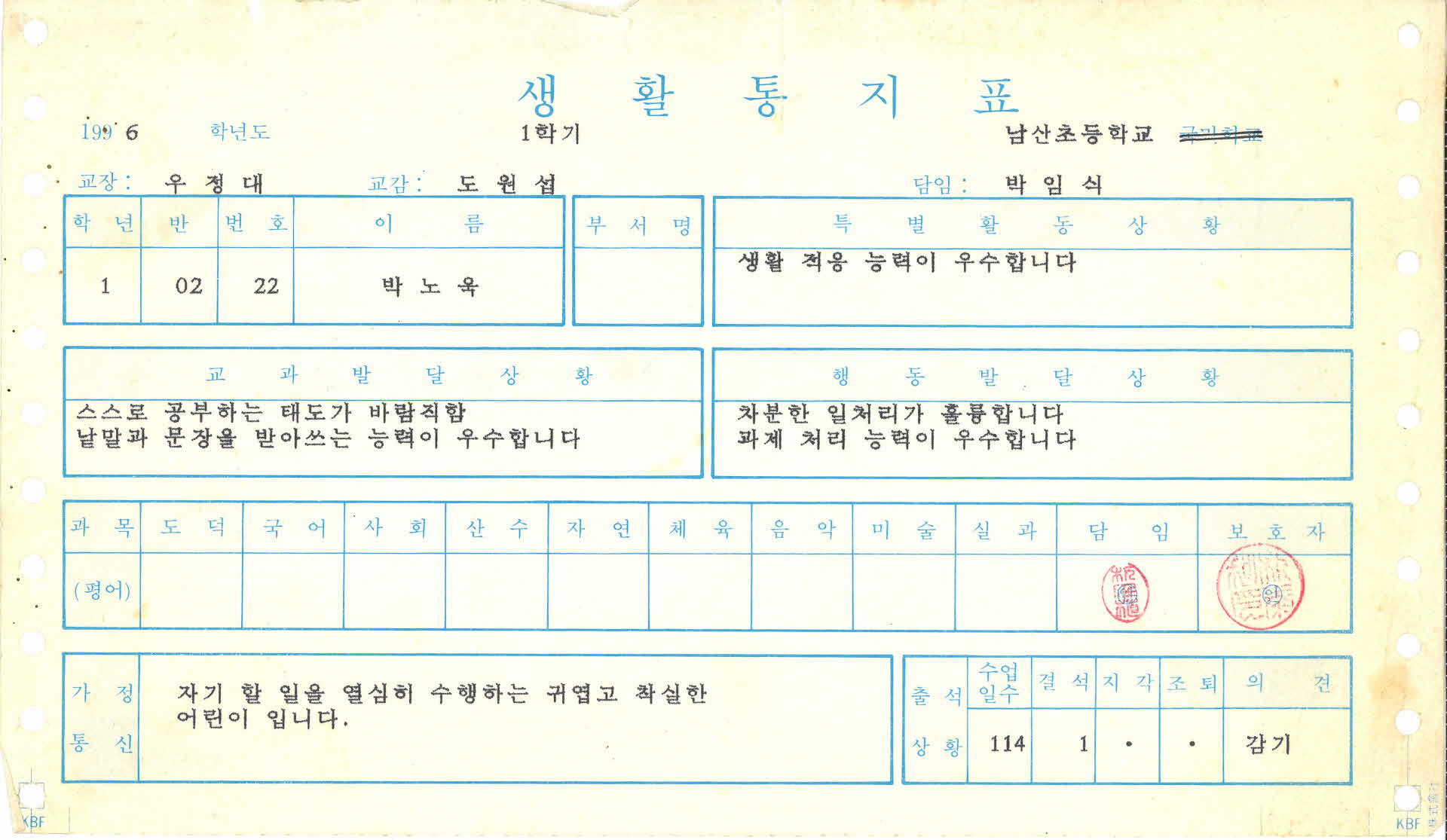 | 기록물명 | 1996학년도 1학기 생활통지서 | ||