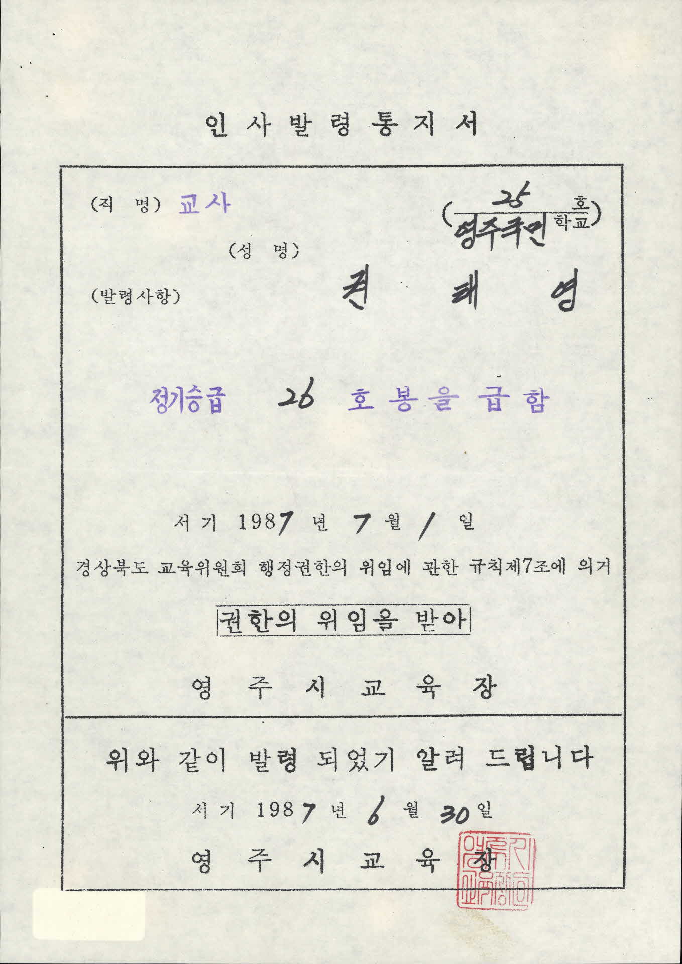이 인사발령통지서는 경상북도교육위원회 행정권한의 위임에 관한 규칙 제7조에 의한 영주시 교육장(이진수)이 1987년 7월 1일 자로 영주시 영주초등학교 교사 권태영을 26호봉으로 정기 승급을 하고, 이 발령 사실은 1987년 6월 30일 영주시 교육장이 통지서를 보내 알렸다.