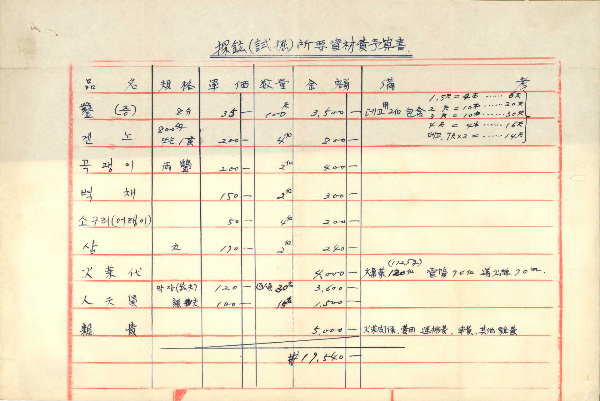 탄광 자재 가격 산출내역