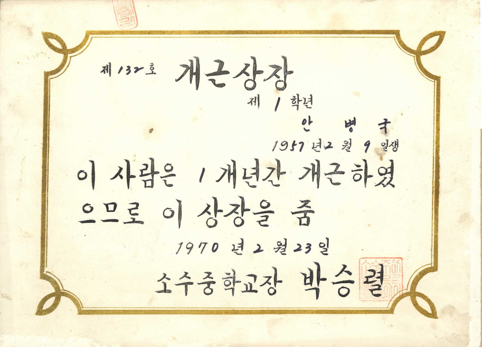 | 기록물명 | 소수중학교 1년 개근상 | ||