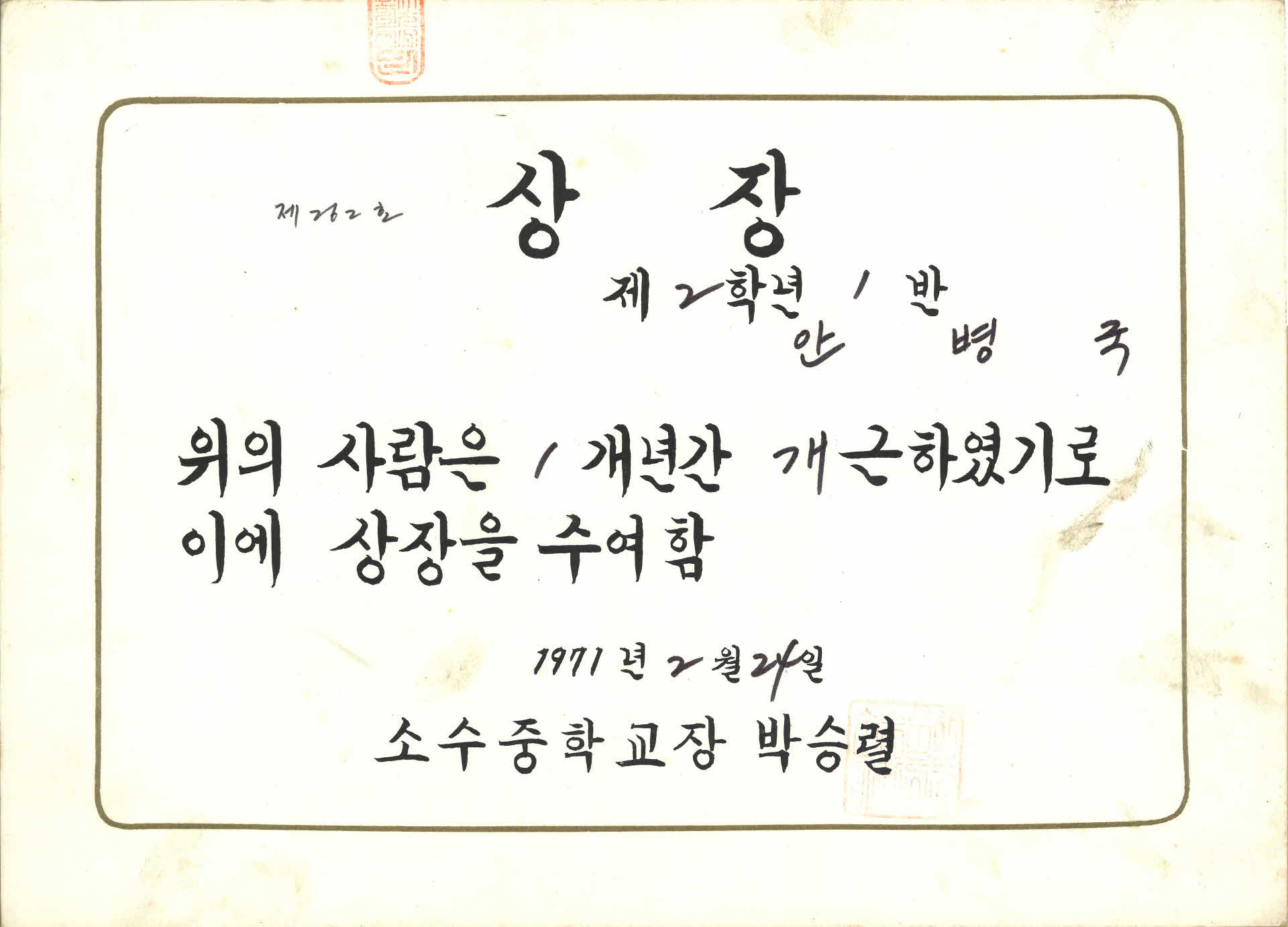 | 기록물명 | 소수중학교 1년 개근상 | ||