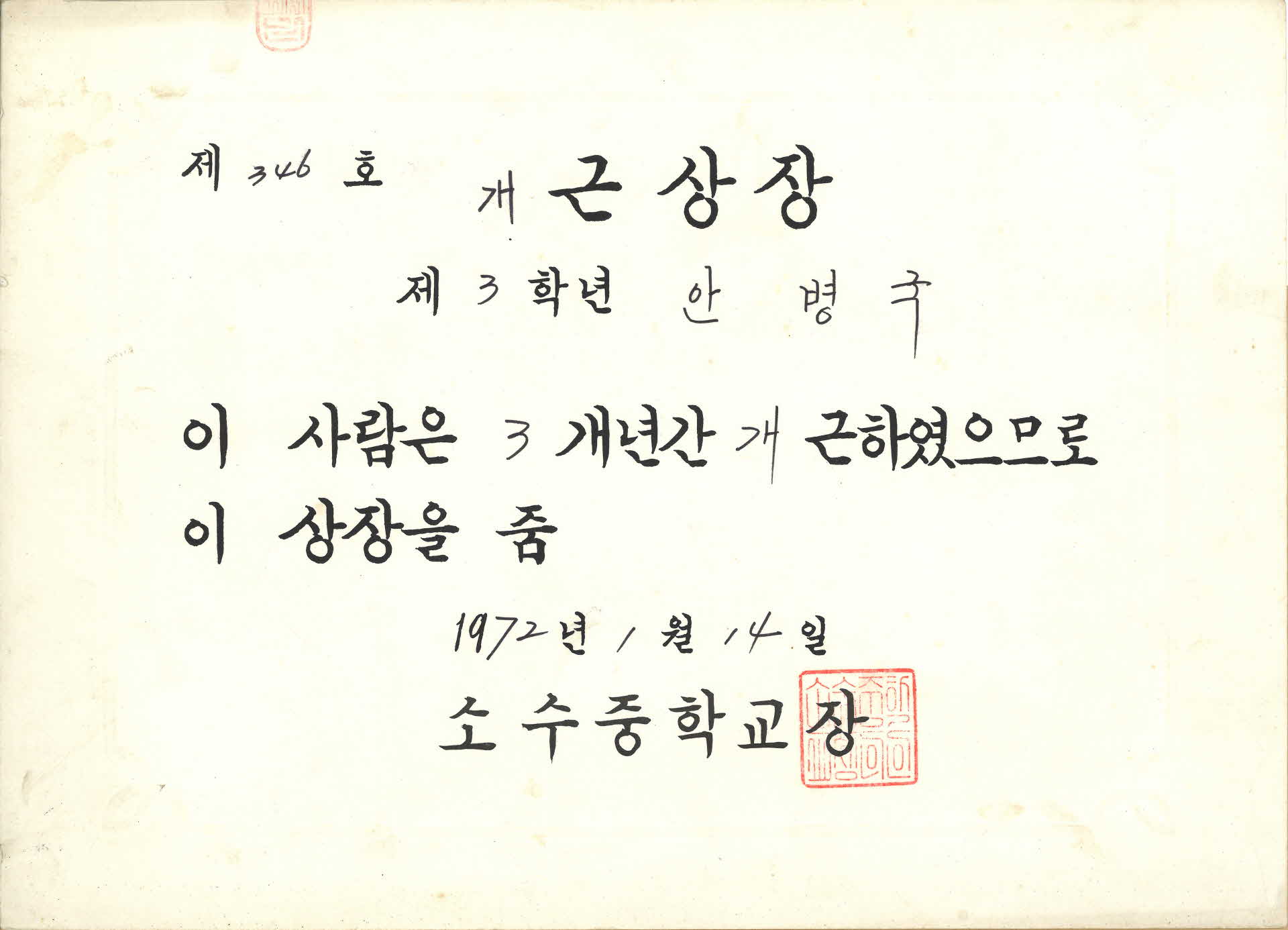 | 기록물명 | 소수중학교 3년 개근상 | ||