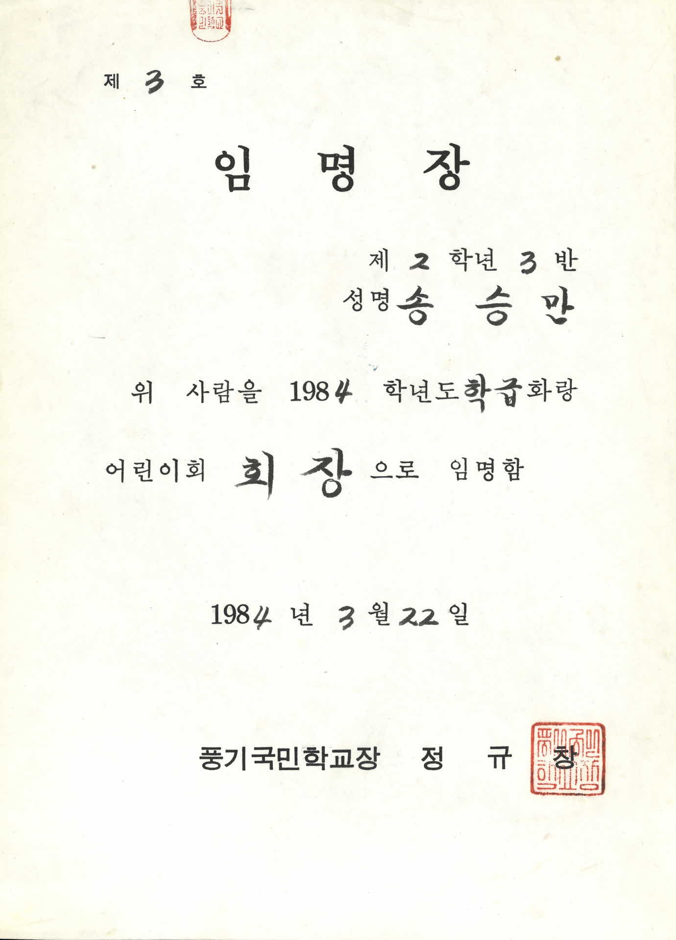 | 기록물명 | 제 3호 어린이회 회장 임명장 | ||