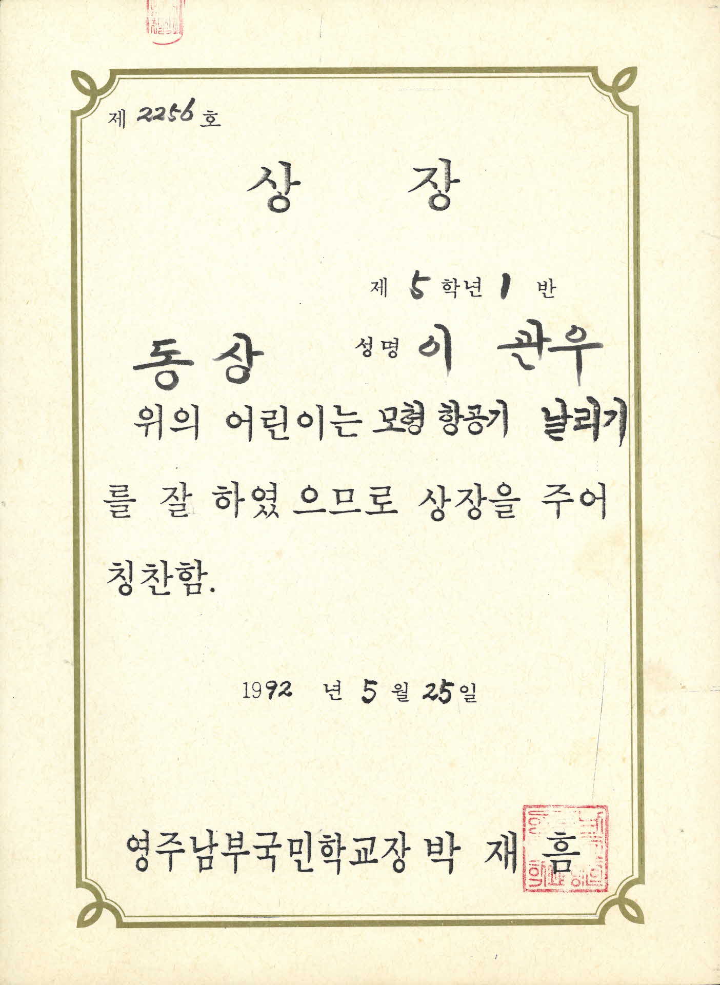 영주남부국민학교 모형항공기날리기대회 동상 상장