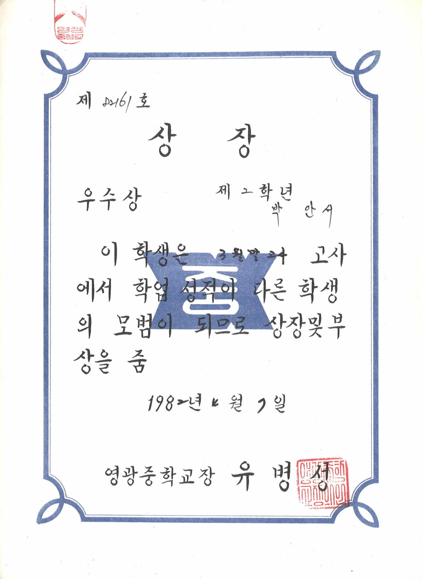 | 기록물명 | 영광중학교 3월 학업성적 우수 상장 | ||