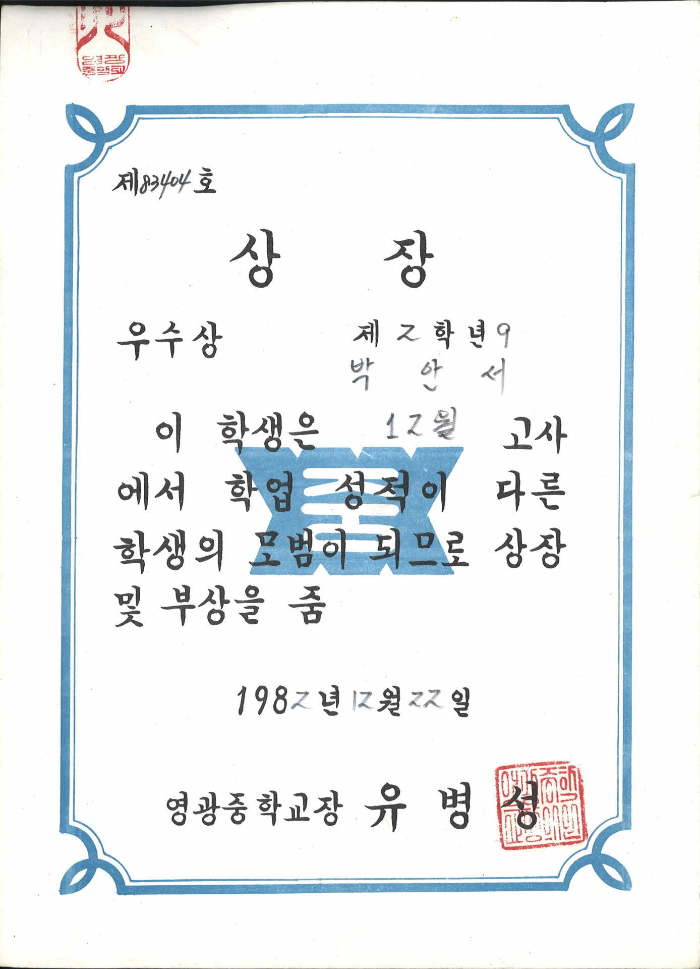 영광중학교 12월 학업성적 우수 상장