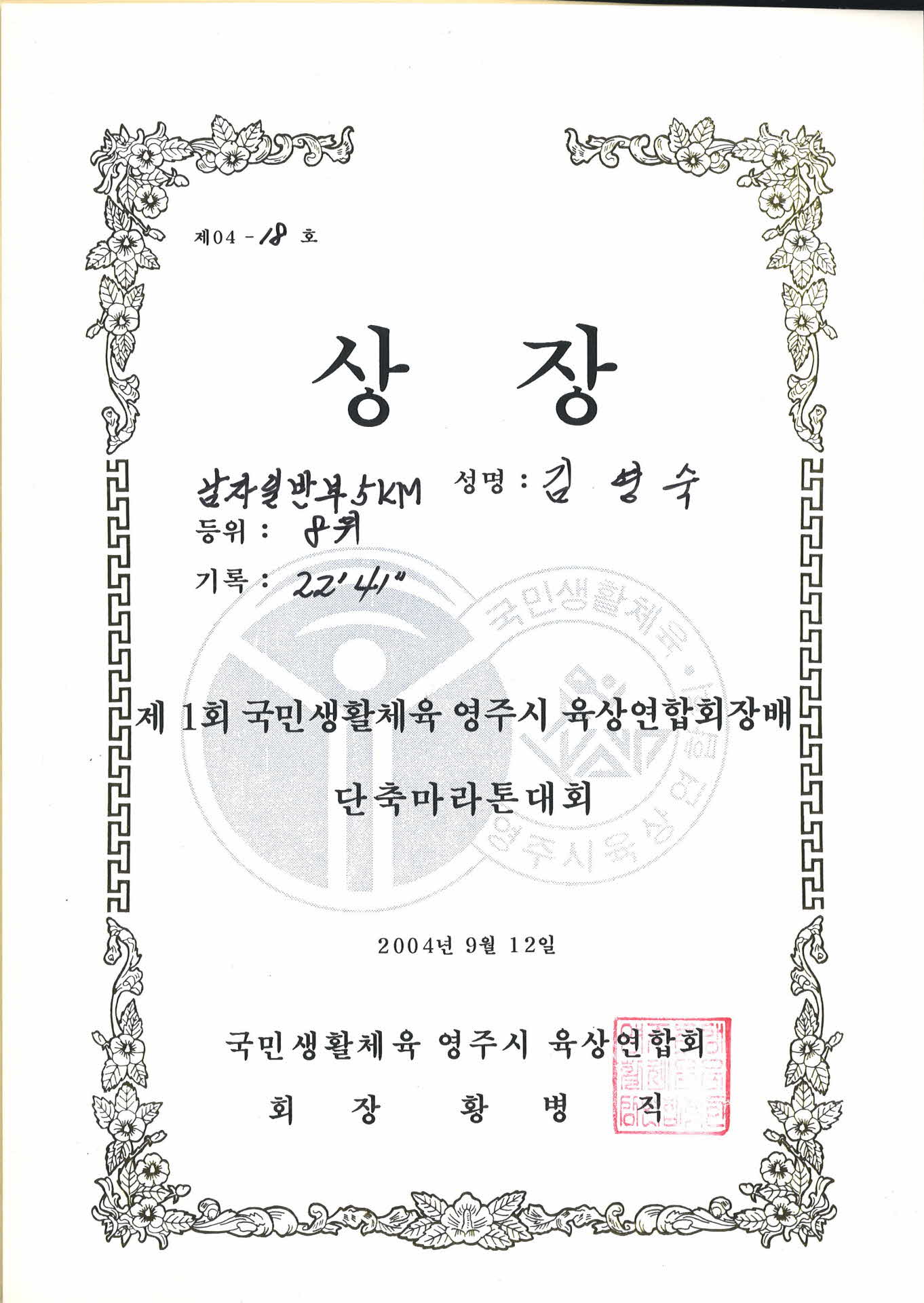 상장 남자일반부 5KM 김영숙