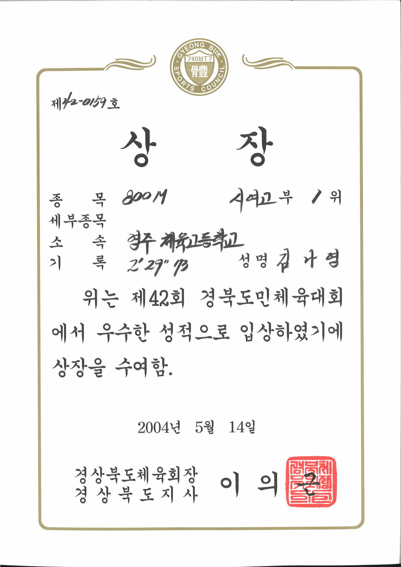 | 기록물명 | 800M 시여고 1위 제42회 경북도민체육대회 상장 | ||