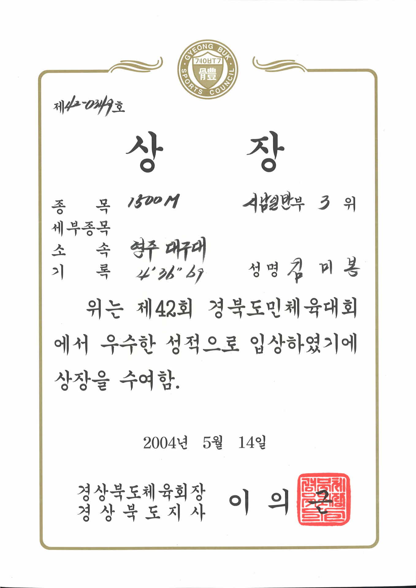 1500M 시남일반 3위 제42회 경북도민체육대회 상장 > 영주, 영주사람