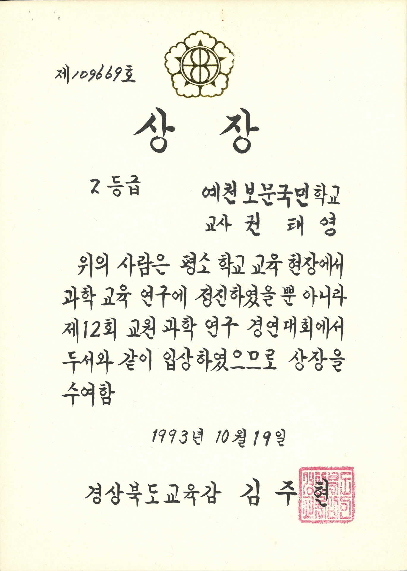 경상북도 교육감 김주현이 1993년 10월 19일 평소 학교 교육 현장에서 과학 연구에 정진하였을 뿐 아니라 제12회 교원 과학 연구 경연대회에서 2등급에 입상한 예천보문초등학교 교사 권태영에게 수여한 제109669호 상장이다.