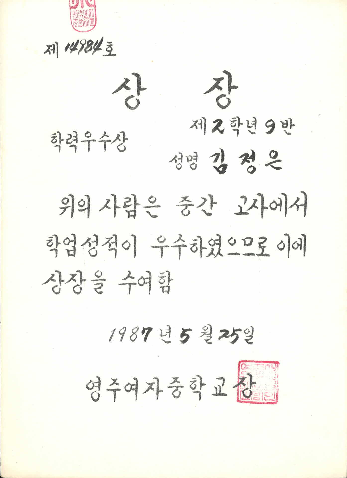 | 기록물명 | 1987년 영주여자중학교 학력우수 상장 | ||
