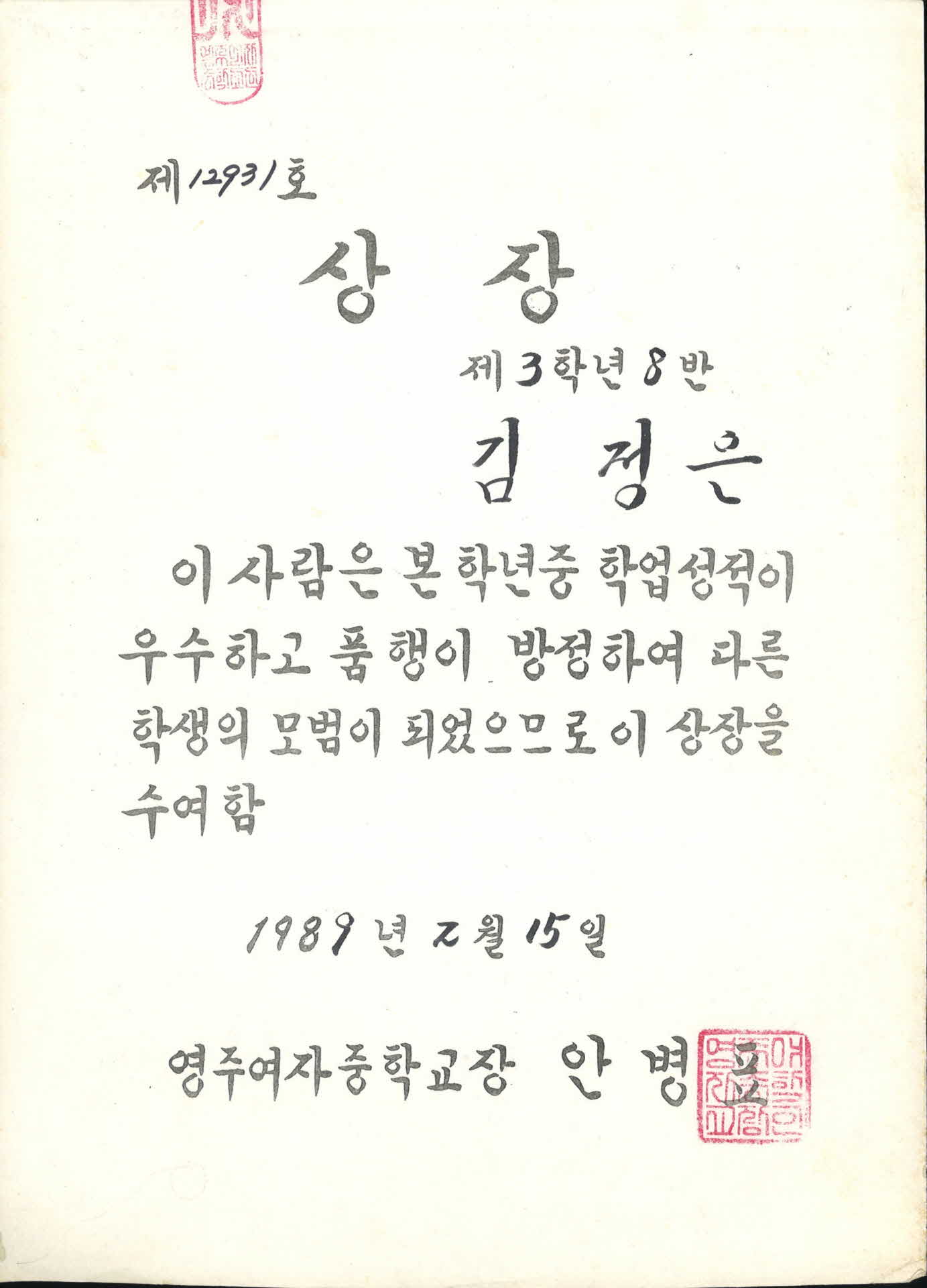 | 기록물명 | 1989년 영주여자중학교 상장 | ||