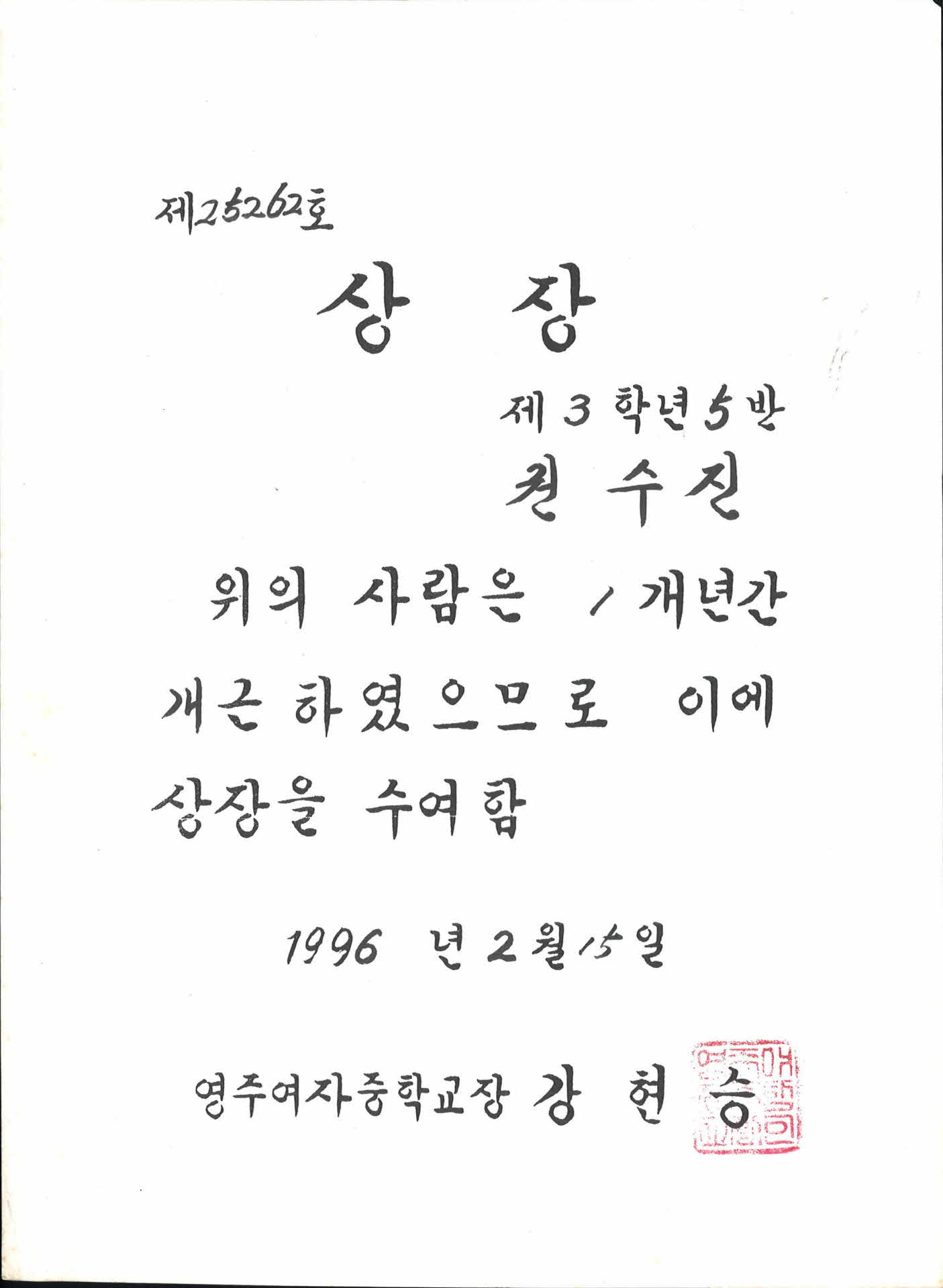 영주여중 1년 개근 상장 > 영주, 영주사람