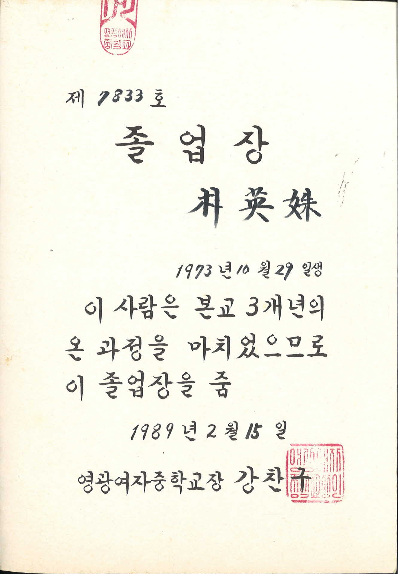 | 기록물명 | 1989년 영광여중 졸업장 | ||