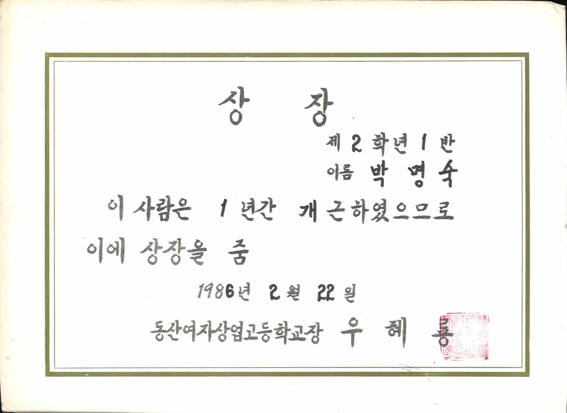 | 기록물명 | 동산여상 1년 개근 상장 | ||