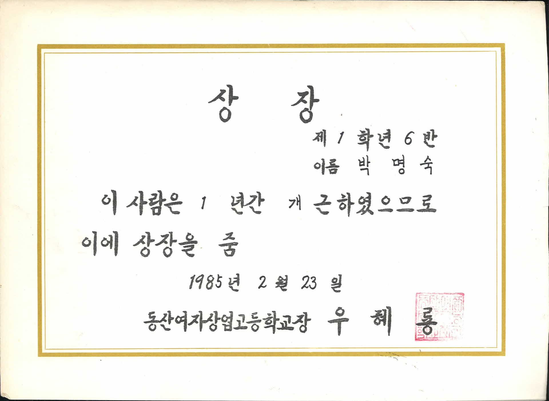 | 기록물명 | 동산여상 1년 개근 상장 | ||