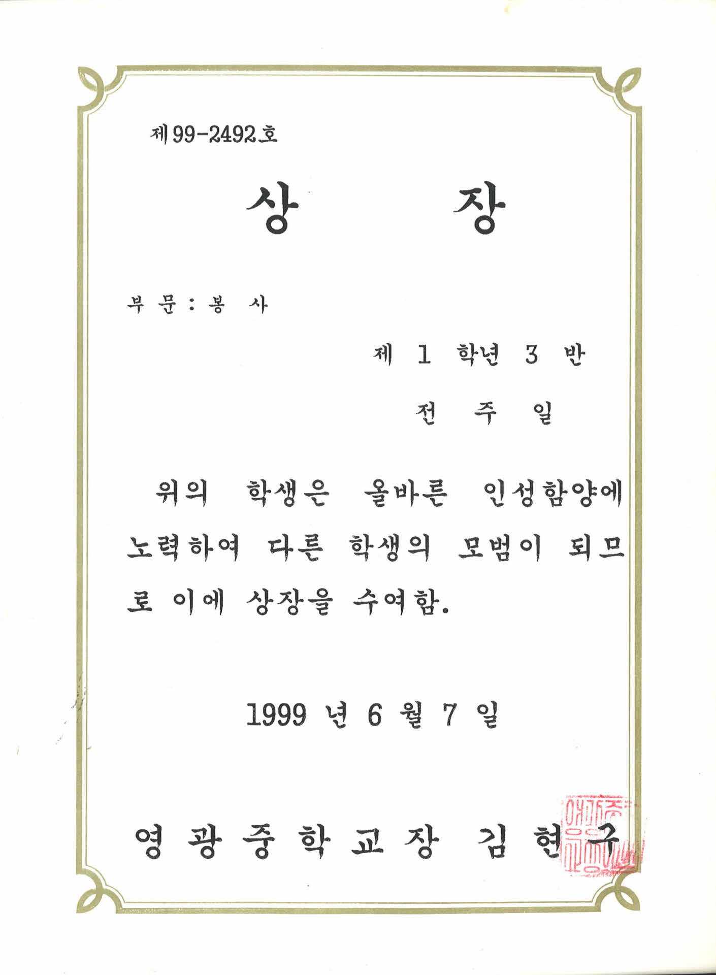 영광중학교 봉사 상장