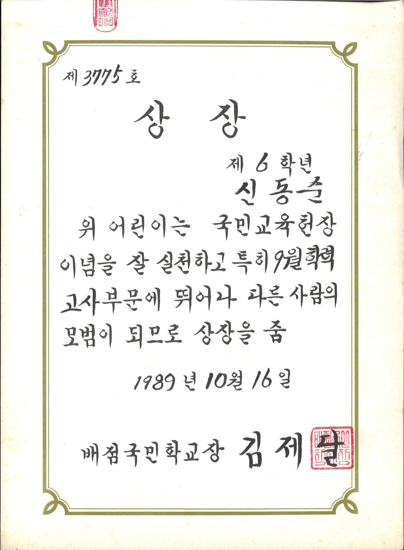 1989년도 배점국민학교 상장