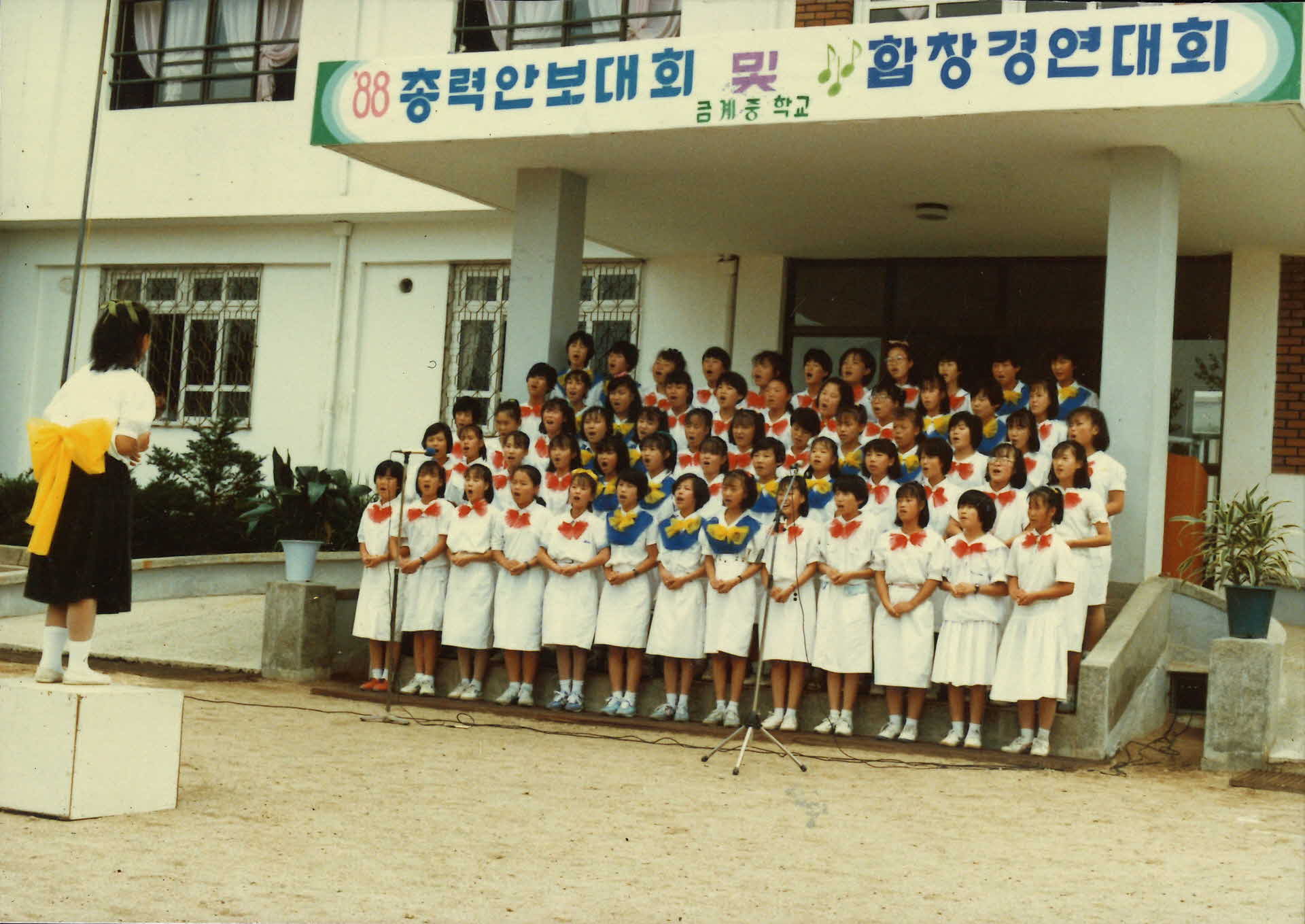풍기 금계중학교 현관에서 통일된 복장을 한 소녀들이 88년 총력 안보대회 및 합창 경연 대회에 참여 하여 단체로 찍은 사진이다.