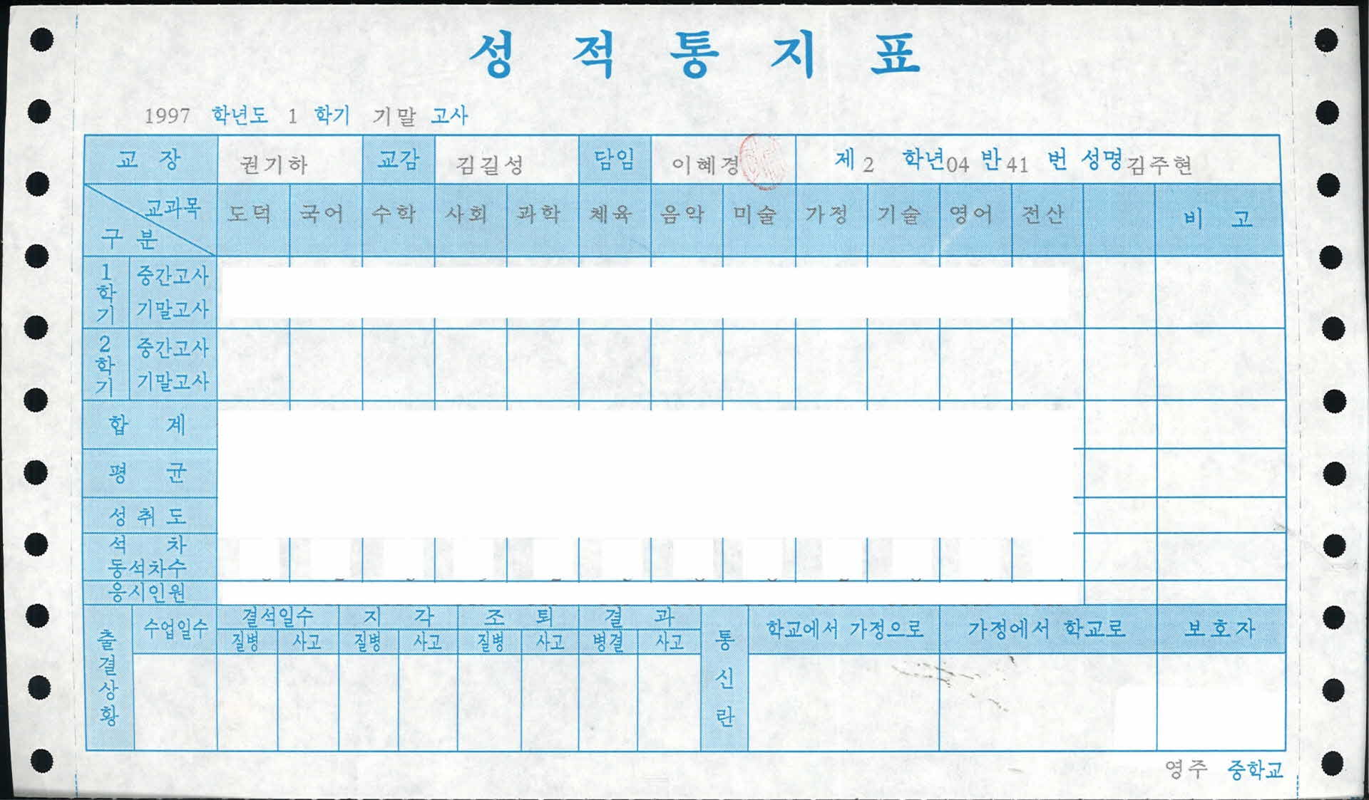 | 기록물명 | 1997년 영주중학교 성적통지표 | ||
