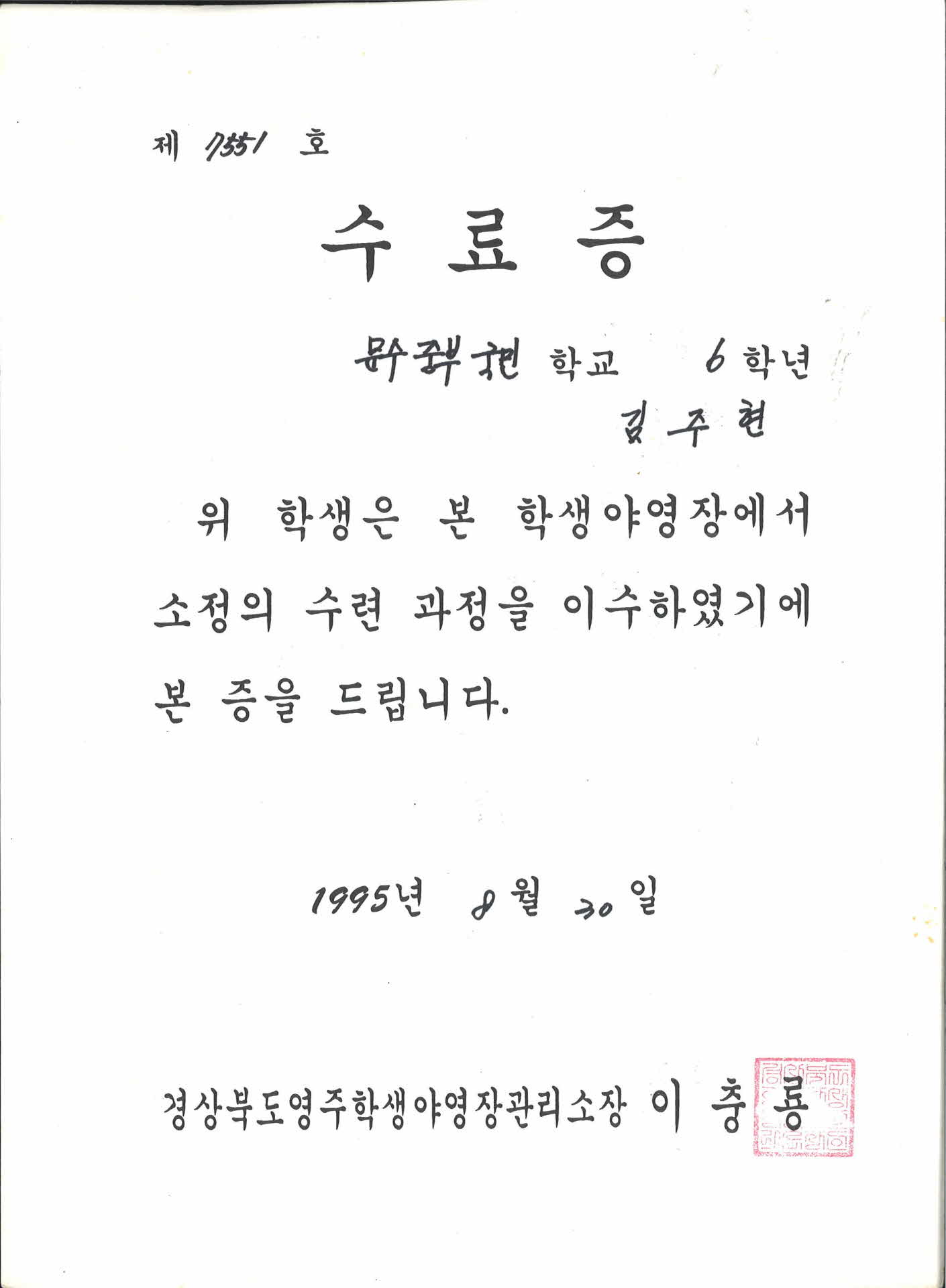 | 기록물명 | 영주학생야영장 수련과정 수료증 | ||