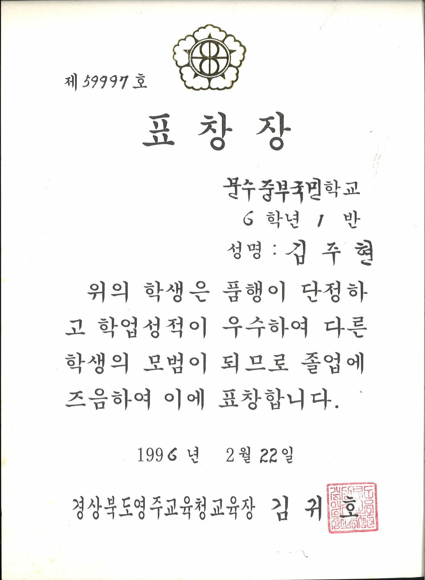 | 기록물명 | 문수중부국민학교 표창장 | ||