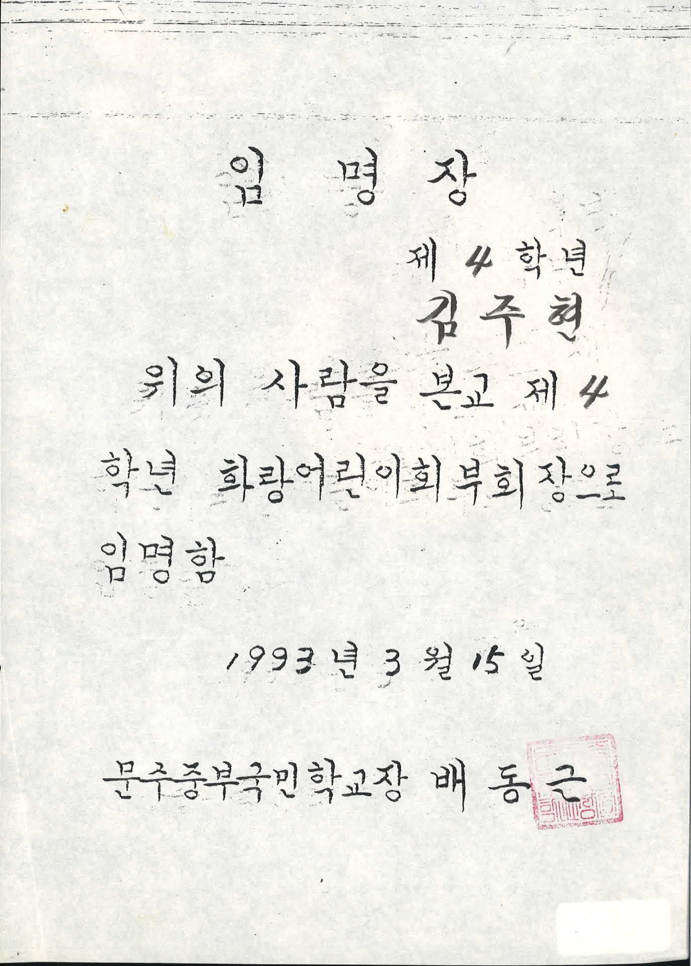 문수중부국민학교 화랑어린이회 부회장 임명장