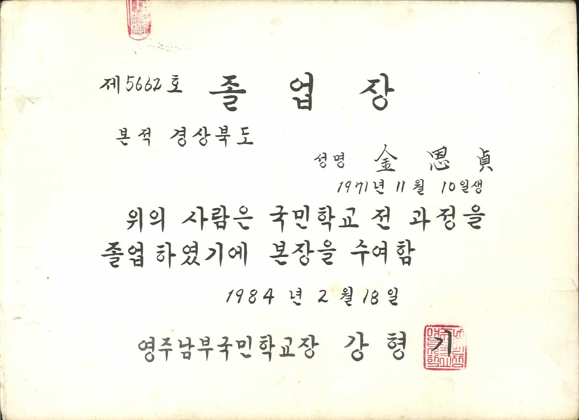 | 기록물명 | 영주남부국민학교 졸업장 | ||