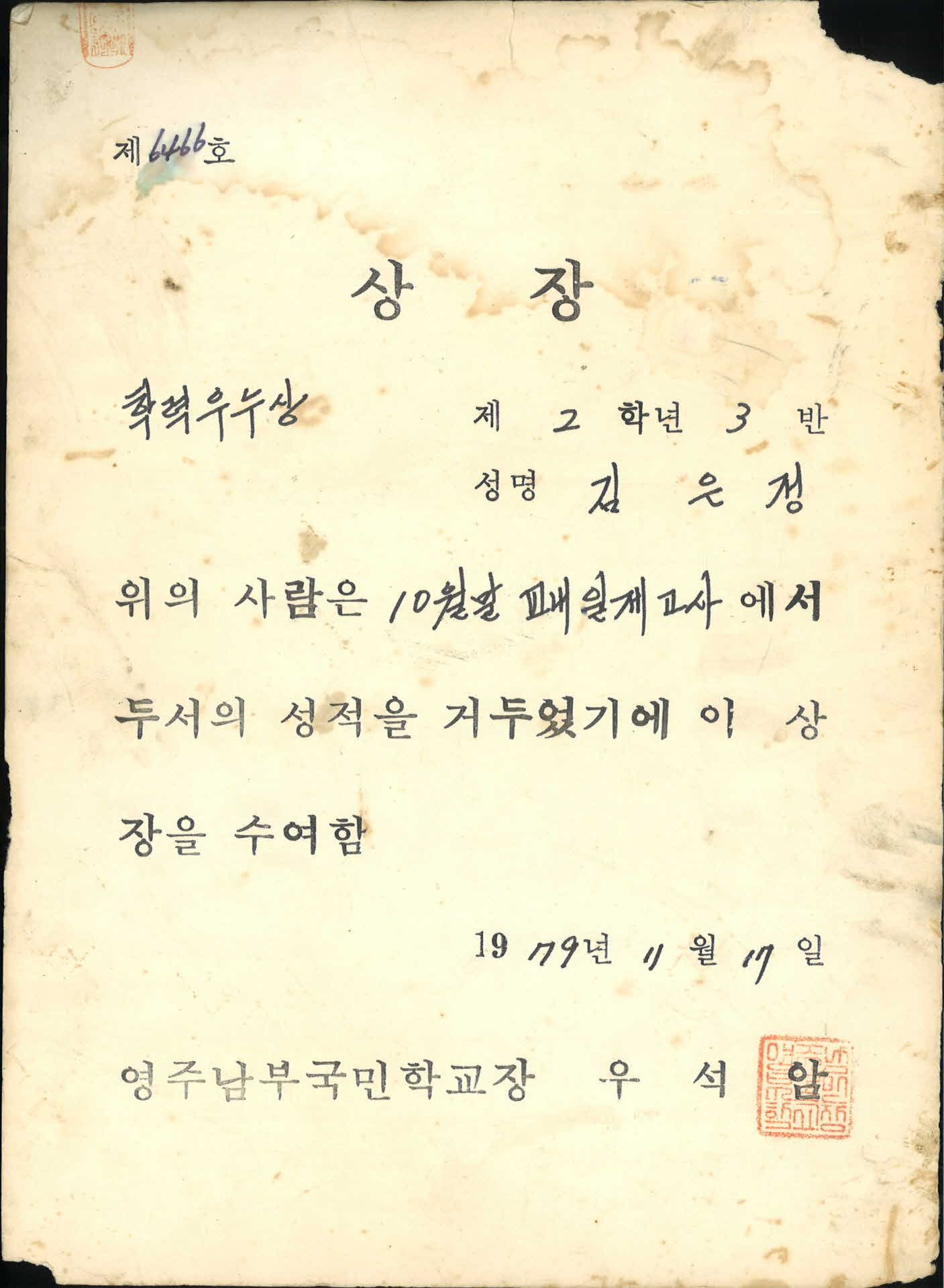 | 기록물명 | 영주남부국민학교 일제고사 학력우수 상장 | ||