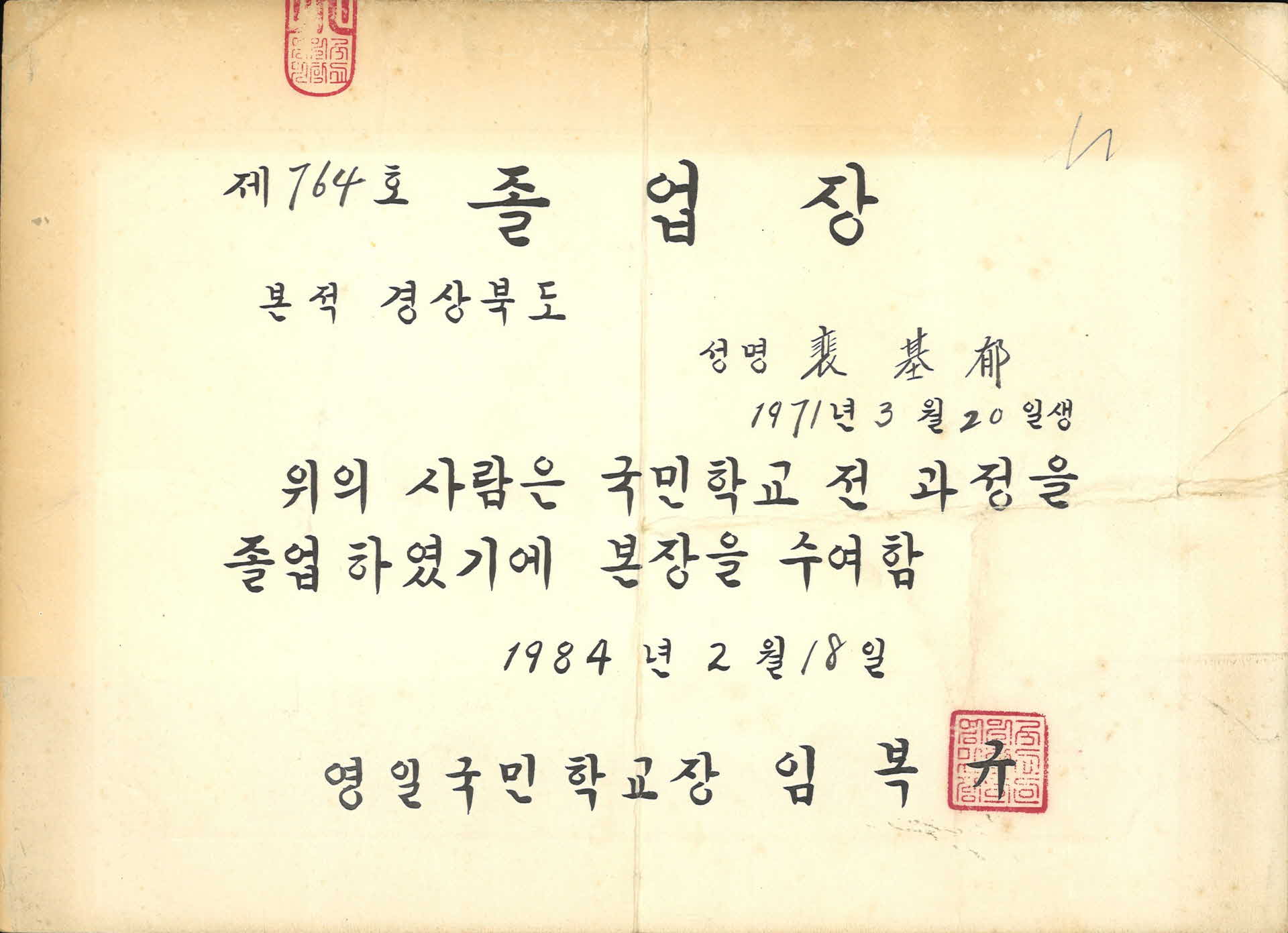 영일국민학교 졸업장