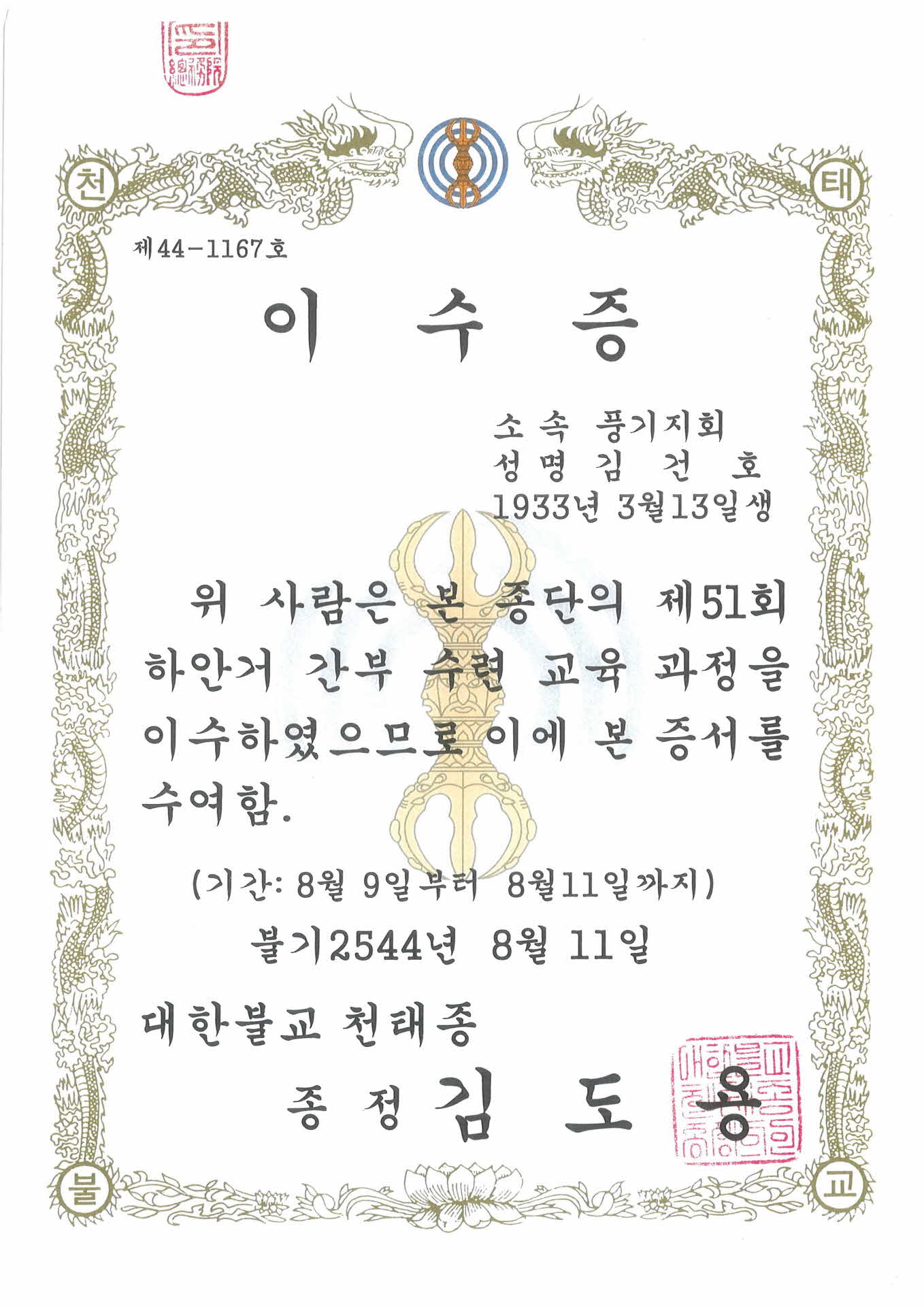| 기록물명 | 제44-1167호 이수증-사본 | ||