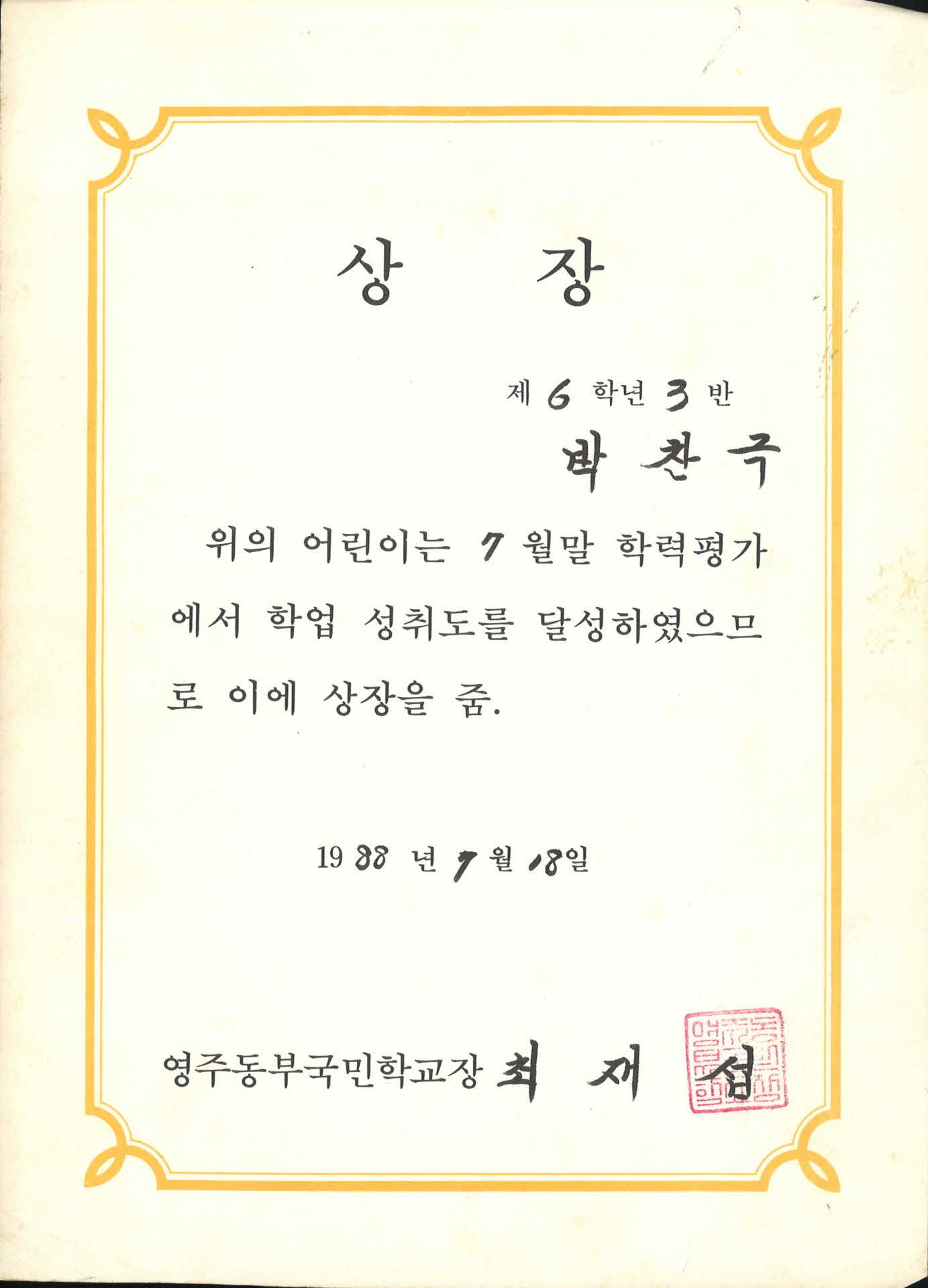 1988년 영주동부국민학교 학업성취도 상장